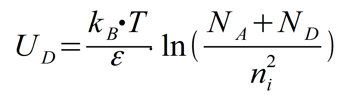 Das undotierte Halbleitersubstrat wäre nur extrem schlecht leitend und schon eher als ein Isolator zu bewerten. Das bedeutet, dass dessen eigene freie (intrinsische) Ladungsträgerdichte ni nur sehr klein ist. In der Formel wird sie zudem noch im Quadrat im Nenner des Bruches berücksichtigt. Insgesamt errechnet sich die Durchlassspannung der Diode nach folgender Gleichung: