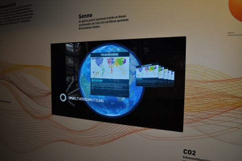Direkt im Eingangsbereich bestaunt der Besucher die Dimensionen der Erdkontinente unter einem anderen Blickwinkel: Die Simulation zeigt, wie "groß" (oder eben manchmal auch sehr "klein") Kontinente gemessen an ihren Straßennetzen, dem CO2-Ausstoß und der Nutzung von Kernenergie sein würden. Bemerkenswert: Der eigentlich sehr große Kontinent Afrika schrumpft wie Dörrobst, während im Vergleich dazu Nordamerika und Europa aber auch Asien überdimensionale Ausmaße annehmen, wenn die Verkehrslasten und die CO2-Emmissionen betrachtet werden. An einen zweiten Bildschirm bietet sich dem Besucher die Chance, seinen individuellen ökologischen Fußabdruck auf dieser Welt zu berechnen.